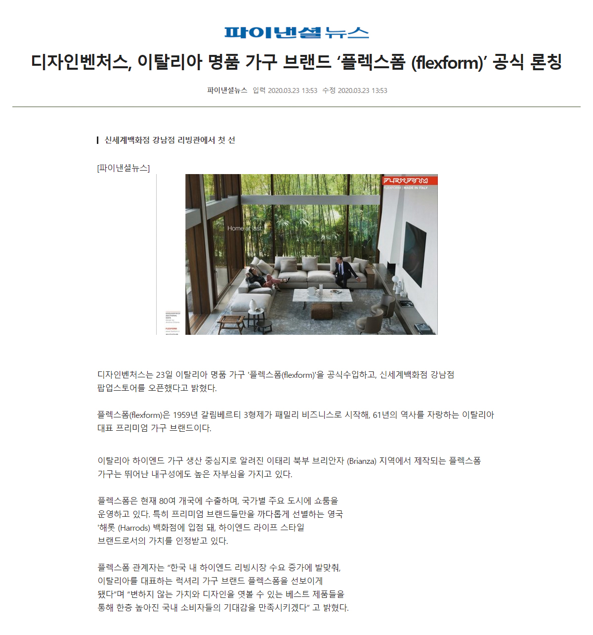 디자인벤처스, 이탈리아 명품 가구 '플렉스폼' 론칭 최고관리자 2021-07-23 최고관리자 MEDIA 0 1309 2021.07.23 15:19 디자인벤처스, 이탈리아 명품 가구 '플렉스폼' 론칭