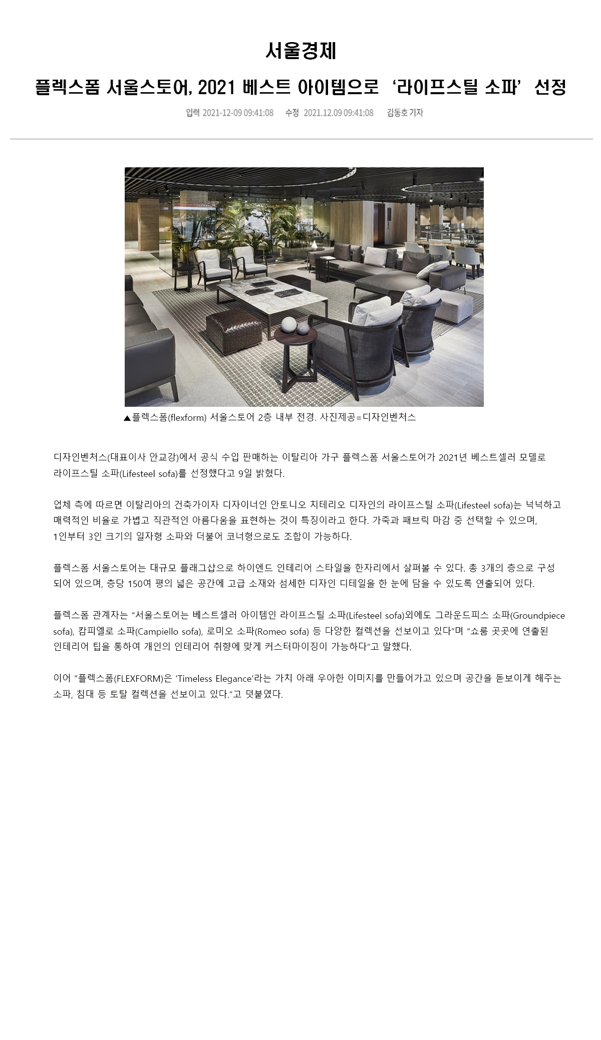플렉스폼 서울스토어, 2021 베스트 아이템으로 '라이프스틸 소파' 선정 최고관리자 2021-12-29 최고관리자 MEDIA 0 1128 2021.12.29 13:51 플렉스폼 서울스토어, 2021 베스트 아이템으로 '라이프스틸 소파' 선정